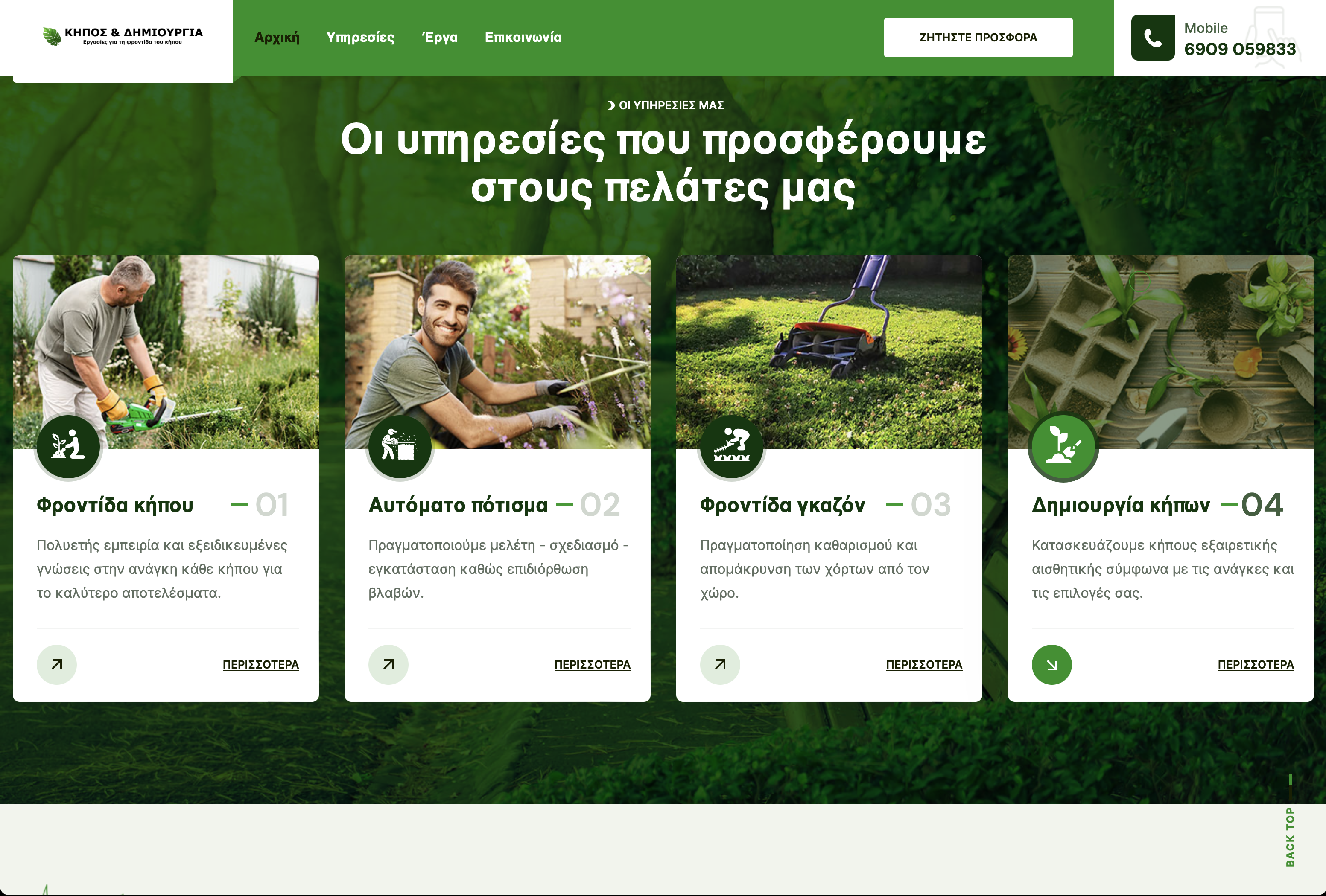 Με μεγάλη χαρά ανακοινώνουμε ότι η ομάδα μας ολοκλήρωσε επιτυχώς ένα ακόμα απαιτητικό project: την δημιουργία της νέας ιστοσελίδας της εταιρείας παροχής ολοκληρωμένων υπηρεσιών κηπουρικής "ΚΗΠΟΣ ΚΑΙ ΔΗΜΙΟΥΡΓΙΑ".